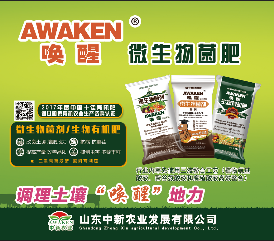 唤醒系列生物菌肥、有机水溶肥是山东中新农业发展有限公司为响应国家提出的推行绿色发展方式,增强农业可持续发展能力,推进农药、化肥零增长行动等涉农新政研发推出新一代功能型生物有机肥料。产品以安全健康、土壤改良、绿色环保、增加产量,改善农产品品质为特色,涵盖生物有机肥,微生物菌剂,生物有机水溶肥等,能够满足国家对实现绿色农业可持续发展的迫切需求,已得到了广大用户的高度认可,荣获“2017年度中国十佳有机肥”称号,并已通过“有机农业生产资料认证”。