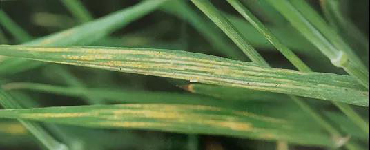 条锈病初期出现鲜黄色粉末,并且排列成行,就像是被缝纫机扎过后的针脚一样,后期叶片开始破裂,出现铁锈色一样的粉状物。小麦近成熟时,叶鞘上出现圆形至卵圆形黑褐色夏孢子堆,散出鲜黄色粉末。后期产生黑色冬孢子堆,粉末呈短线状,扁平,堆到一起,隐藏在表皮内,成熟时不开裂。