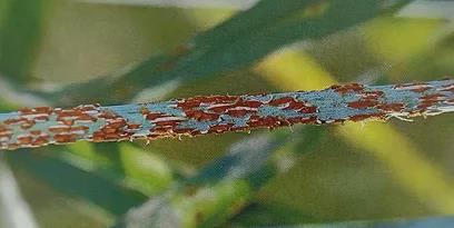 叶锈病主要为害叶片,产生疤疹状病斑,很少发生在叶鞘及茎秆上。圆形至长椭圆形,橘红色,在叶片上不散生。后期呈黑色,扁平,排列散乱,但成熟时不破裂一般多发生在叶片的正面,少数可穿透叶片。小麦