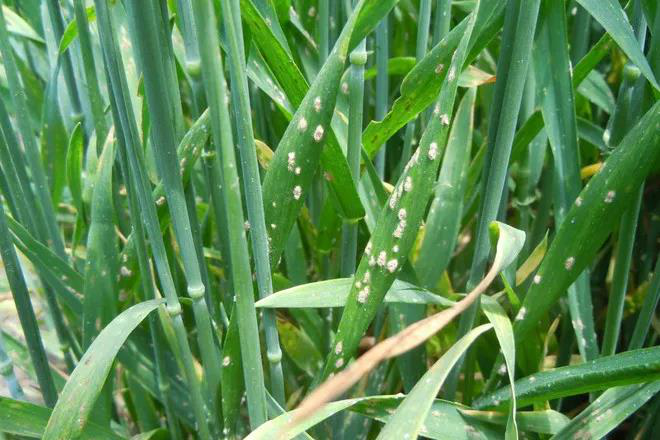 主要为害叶片,严重时也可为害叶鞘、茎秆和穂部。病部初产生黄色小点,而后逐渐扩大为圆形或椭圆形的病斑,表面生一层白粉状霉层,霉层以后逐渐变为灰白色,最后变为浅褐色,其上生有许多黑色小点。病斑多时可愈合成片,并导致叶片发黄枯死。茎和叶鞘受害后,植株易倒伏。