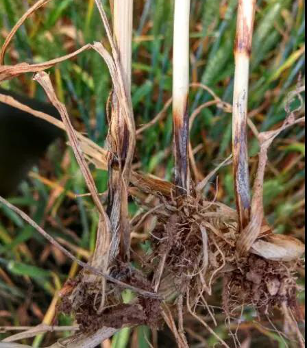 小麦抽穗后田间病株成簇或点片状发生早枯白穗,病根变黑,易于拔起。在茎部表面及叶鞘内布满紧密交织的黑褐色菌丝层,呈“黑脚”状,后颜色加深呈黑膏药状,上密布黑褐色颗粒状子囊壳。