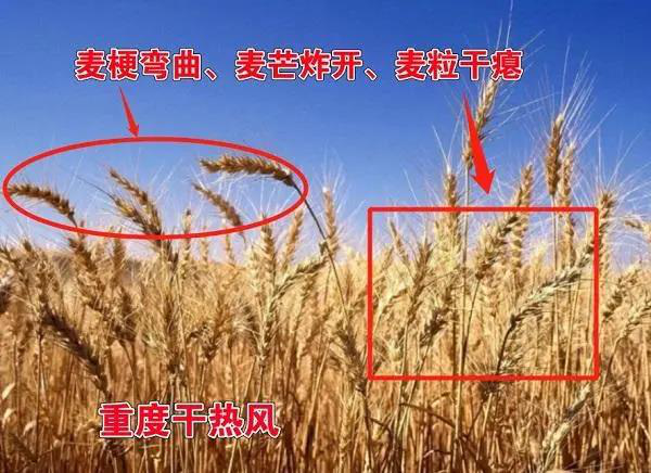干热风可使麦株的芒、穗、叶片和茎秆等部位均可受害。从顶端到基部失水后青枯变白或叶片卷缩萎凋,颖壳变为白色或灰白色,籽粒干瘪,千粒重下降。